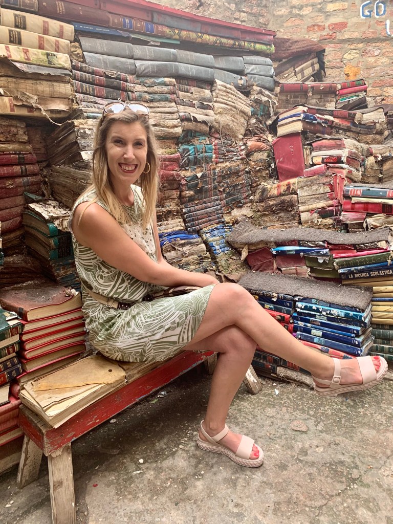 On our third day in Venice, we declared this was the day we took our gondola ride! You can find the gondolas anywhere along the canals in Venice. We chose one that wasn’t so close to the main waterway so we wouldn’t have to compete with other gondolas. The price for a gondola ride was 80 euros for one hour. We opted to share the gondola together to split it four ways. The gondola had plenty of room for the four of us. I am happy we chose to do this early morning as it was already quite warm with the sun beating down on us. Our gondola driver shared unique facts about Venice and would whistle a few tunes. After our ride, we ate more gelato, had an easy lunch of sandwiches, and roamed the streets. We stopped at the Libreria Accqua Alta, a famous bookstore in Venice. It has a staircase made of books, cats roaming around, and books displayed in gondolas. It was a unique experience. The night ended with eating at Osteria Fanal Del Codega, a trip advisor traveler’s choice! The restaurant overlooks a canal and is decorated beautifully. The pasta was fantastic, along with other items. I would definitely recommend stopping at this location.