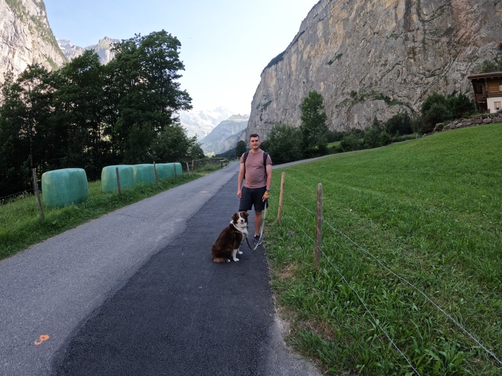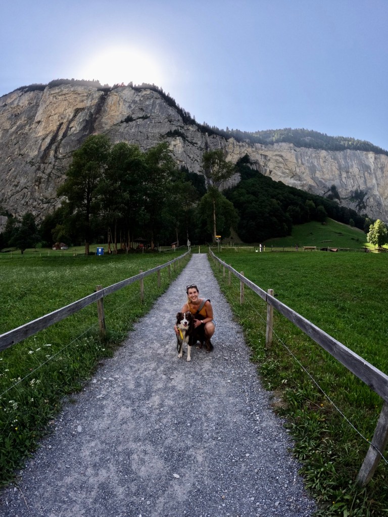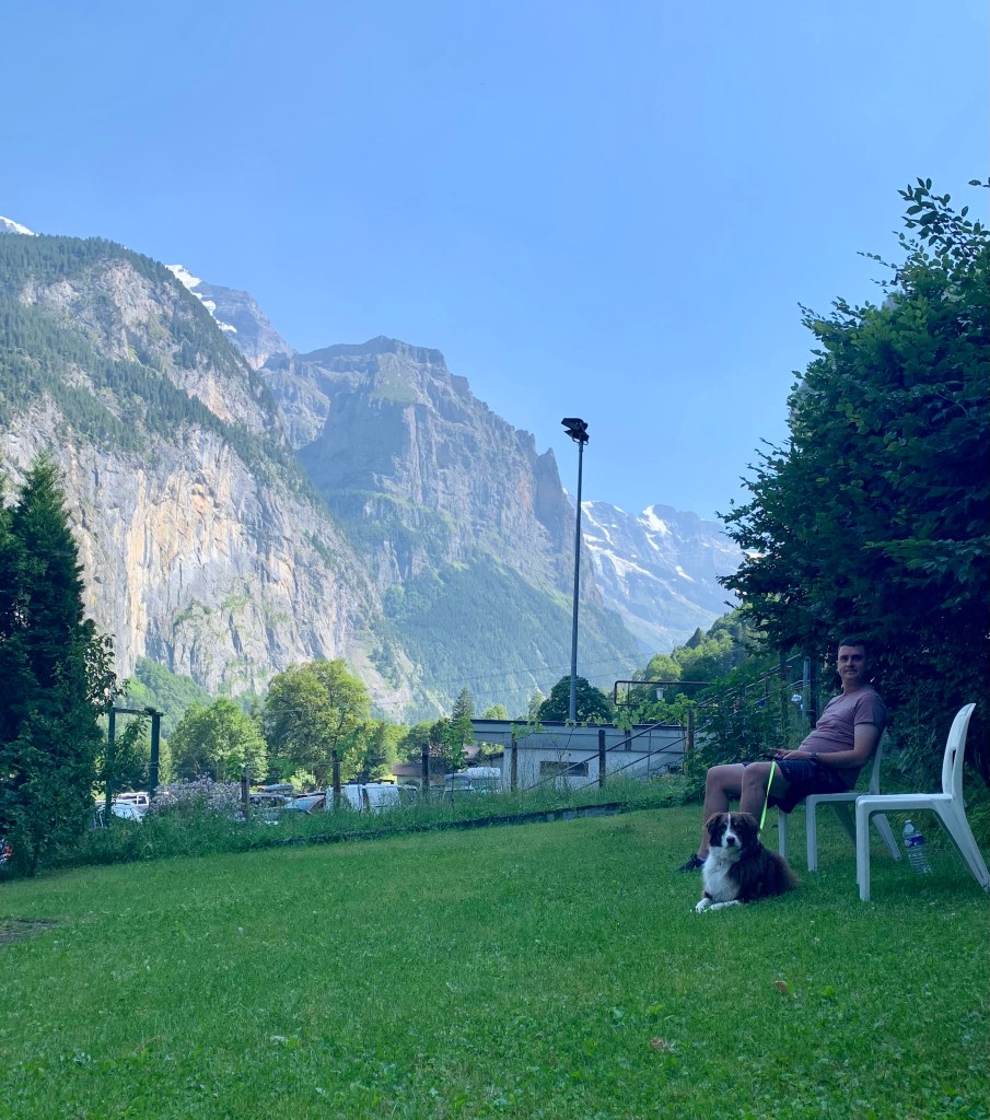 We settled on the town of Lauterbrunnen, home to 72 free-standing waterfalls. These waterfalls come down from the cliffs, where you can gaze at them during your stay. It took some time to find a reasonable dog-friendly Air BNB, but I could not have been happier with our choice! Our drive was over 5 hours long, so we got to the Air BNB around 3PM. We parked in the driveway, which was included with our stay. Our host Angie owes an entire apartment complex that she rents out. We were fortunate to have the lowest level leading into a grassy patio. The Air BNB was spacious, clean, and perfect for our stay. We brought our own food as we know dining out in Switzerland can be pricey. The Air BNB was equipped with everything we needed, but the main perk was the patio with the mountains at our fingertips.