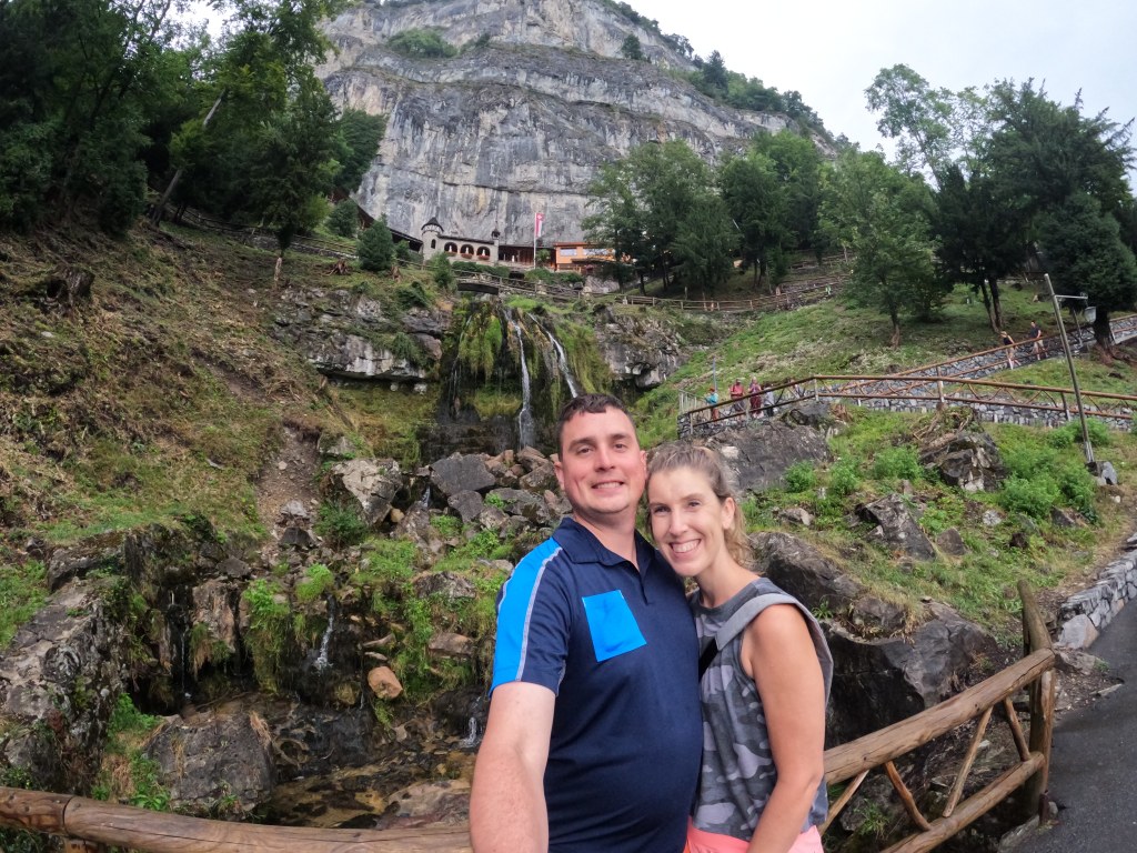 There are additional cable cars that connect Mürren to other Swiss Villages. We took one that led us to Schilthorn. This was back down the mountain, and we had an hour walk back to our Air BNB. This walk led us along the glacier river, perfect for Maxine to cool off. After returning to our Air BNB, we ate lunch and still had no thunderstorms! We then drove to St. Beatus cave, famous for the legend of the dragon-slaying saint who lived there. St. Beatus was near Interlaken, which was a 20-minute drive. There are two different parking areas. The main one was full, so we opted for the second area down the road. The main parking area leads you up a trail that stops at the gift shop and museum. You walk up a hill to get to the cave’s main entrance. Where we parked (the second area) had a steeper climb and led you right to the cave entrance. The cave is open from 9AM – 6PM, costing 18 CHF for adults and 10 CHF for dogs. It is chilly in the caves, but we were so warm from outside that it felt fantastic. The caves are amazing, with different stops along the way for you to read about what you are seeing. They have stairs, handrails, and a simple route to follow. It can get slick in the cave from the water, so make sure you have the proper attire. Maxine did great in them, and we enjoyed being able to bring her. I recommend seeing these caves, especially if you come in the summer months, because they are cool (regarding temperature and the experience). After we finished it finally down-poured! We returned to the Air BNB, sat in the covered portion of the patio, and watched the rain fall. We could tell the mountains were receiving plenty of rain as the waterfalls became heavier coming off the cliffs.